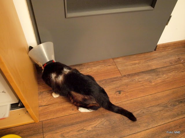 Kiedy wstała znowu i przyszła na dół, podczas brania na ręce zaczęła głośno i boleśnie miauczeć. Wtedy zaczęłam sprawdzać. I znalazłam kilkucentymetrową ranę i rozdarcie do mięśni schowane w futrze na karku. Nie było co szukać następnych, błyskawicznie się wybraliśmy i pojechaliśmy do weta. Na szczęście mimo soboty jeszcze nas przyjęto.