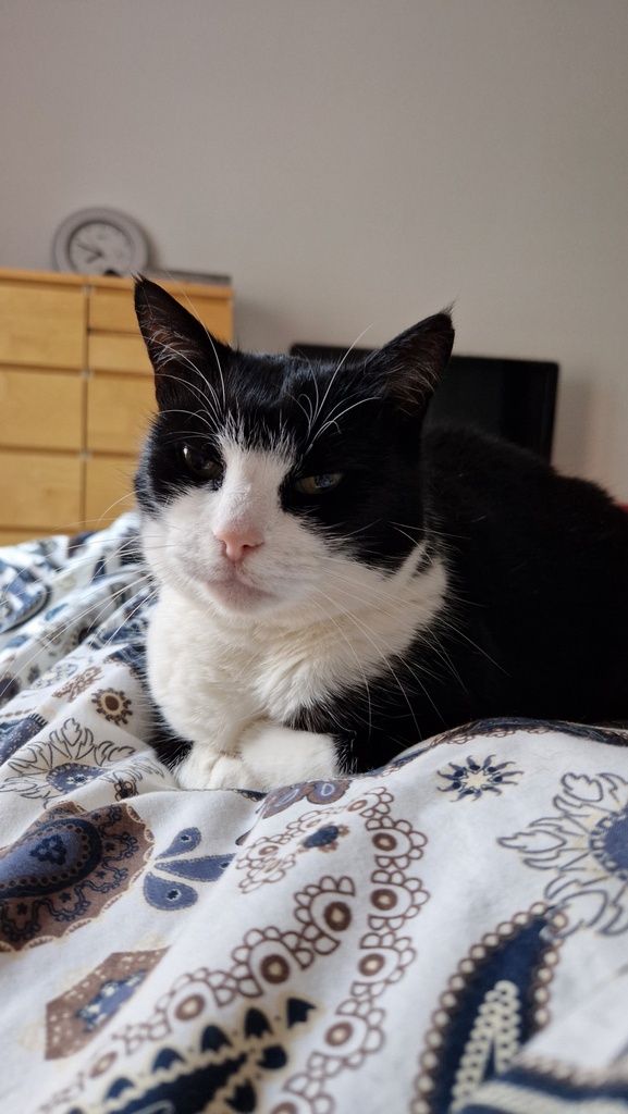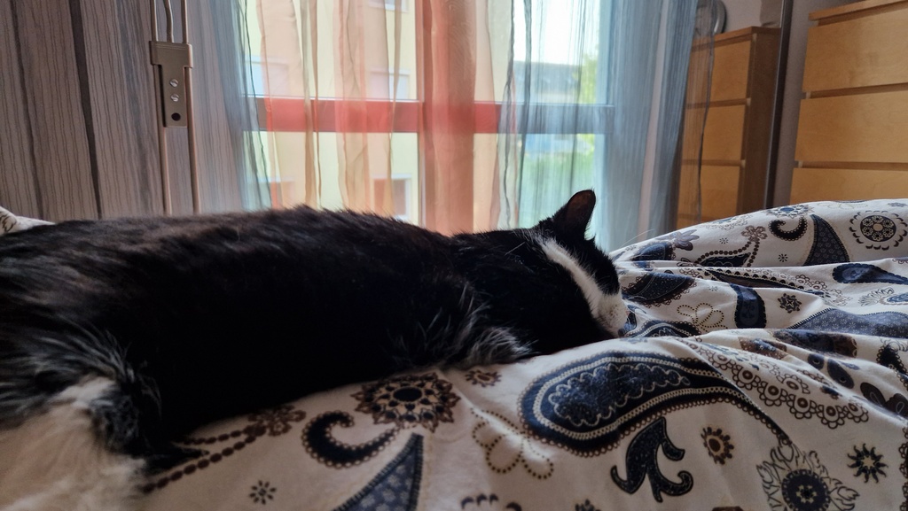 8:00 rano: kot przyszedł z rana i nadal na mnie leży, przejrzałam już Instagram, Facebook, pęchesz i kręgosłup meldują, że dalej nie wyrobią. Ale Mozart jest taka odprężona i szczęśliwa, że wytrzymuję jeszcze parę minut, głaszcząc mruczące puchate stworzenie na moim brzuchu. Nawet w ramach dnia człowieka odwróciła się do mnie prawie mordką, zwykle mam widok na jej zadek!
