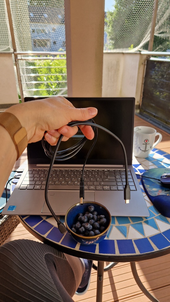 No dobrze, ale są jeszcze fajne zdjęcia na komórce. Podłączam komórkę do komputera przez mini USB, ale komputer krzyczy po 5 minutach, że mu brak prądu, a to jest też gniazdo do ładowania laptopa. Odłączam komórkę, podłączam z powrotem ładowanie laptopa. Dobrze, że ściągnęłam zdjęcia z dziś. To może jeszcze te od miesiąca też. Idę po inny kabel, którym mogę podłączyć komórkę ponownie do komputera i ściągnąć pozostałe zdjęcia.