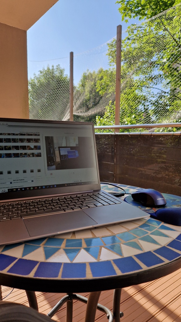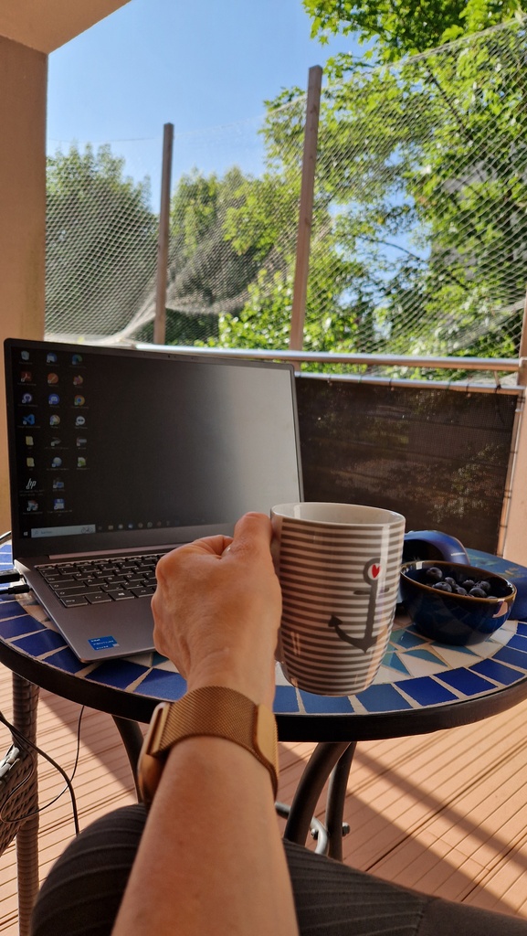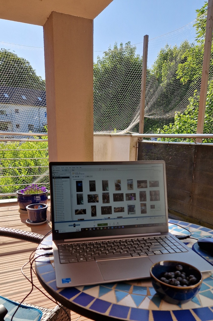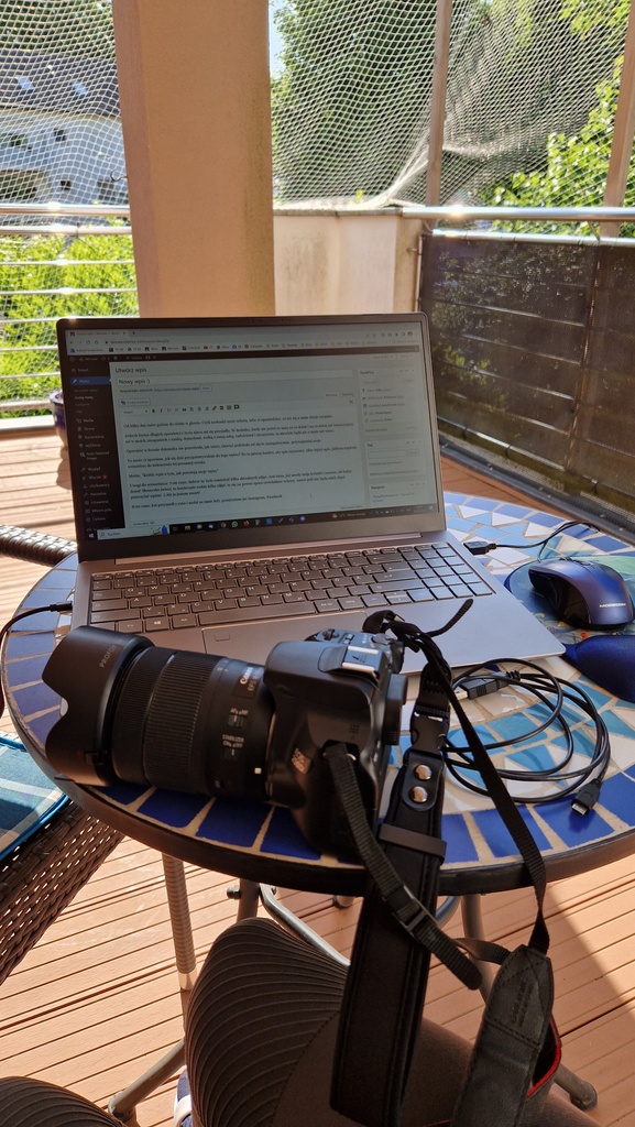 8:30 Oooo, tak tu ładnie, wyjdę na taras. Wychodzę. Trzeba przynieść laptopa. Aha, mam go w plecaku. Wypakowuję laptopa. Ustawiam na stoliku na tarasie, ustawiam ładnie w słońcu stolik i krzesła. No tak. Kabel za krótki. Dobrze, że ostatnio przyniosłam przedłużacz. Podłączam kabel do ładowarki do przedłużacza, jest już w gniazdku. Robię kilka zdjęć aparatem. Kurde, złe ustawienia. Te zdjęcia są za ciemne. A te prześwietlone. Robię inne zdjęcia komórką. Noooo! Te się nadają! Ale tych kilka z aparatu też ładne. I te ostatnie też chcę mieć.