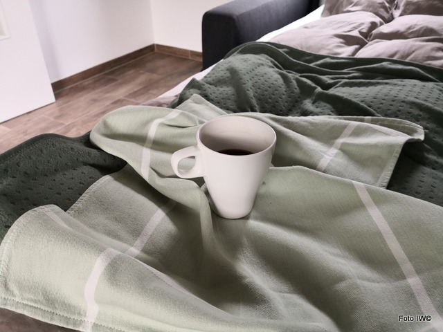 Picie kawy na jakiejś pościeli jest na pewno nie wygodne. Nie mówiąc o tym, że ja bym to zapewne szybko rozlała. Moja teoria jest taka, że kawę na instagramie ustawiają tak tylko do zdjęcia. Robią je, po czym przenoszą na stolik i piją. Przynajmniej ja bym tak zrobiła 😀 Mam wrodzony talent do rozlewania czegokolwiek , więc już wiem jakby to u mnie się skończyło.