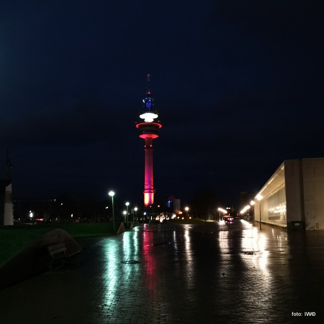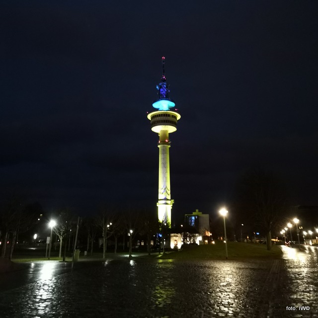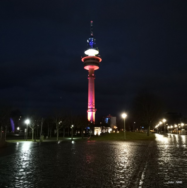 Mieszkam na tyle niedaleko, że od innej strony widzę tę wieżę z okna mojego mieszkania. Niestety jednocześnie w okno wieczorami świeci mi latarnia i z tego powodu nie mogę nacieszyć się różnobarwnymi kolorami tej wieży wieczorem.