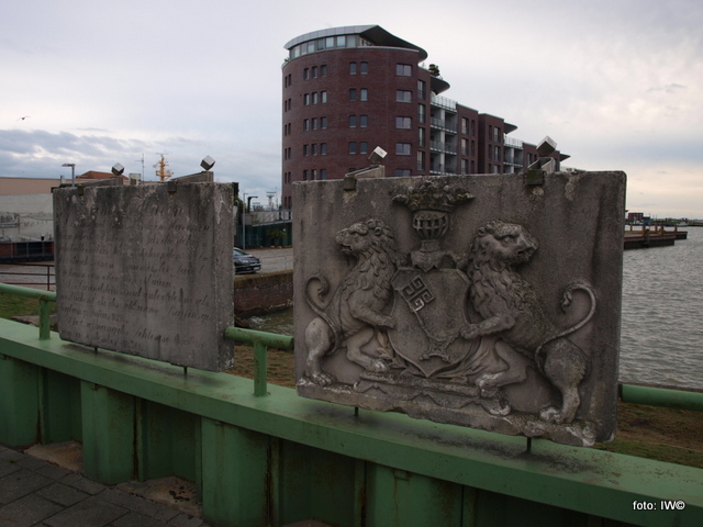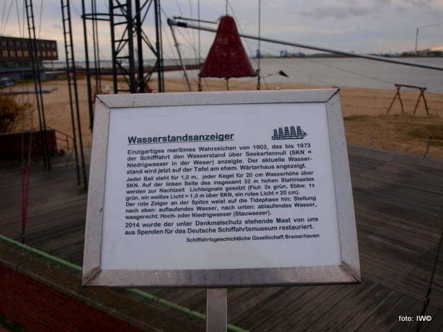 Niestety napis na tablicy pierwszej umieszczonej kilka metrów dalej z widokiem na morze jest mocno zatarty i póki co nie udało mi się go odcyfrować, obok widać natomiast wyraźnie herb Wolnego Miasta Hanzeatyckiego Bremy (tu: kraj związkowy, w którego obrębie znajduje się Bremerhaven).