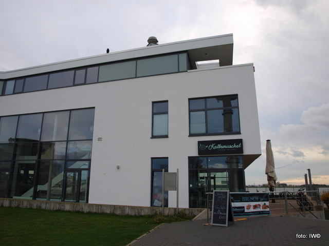Tuż obok, ten biały nowoczesny budynek na planie kwadratu to Restauracja i kawiarnia Kalbsmuschel.